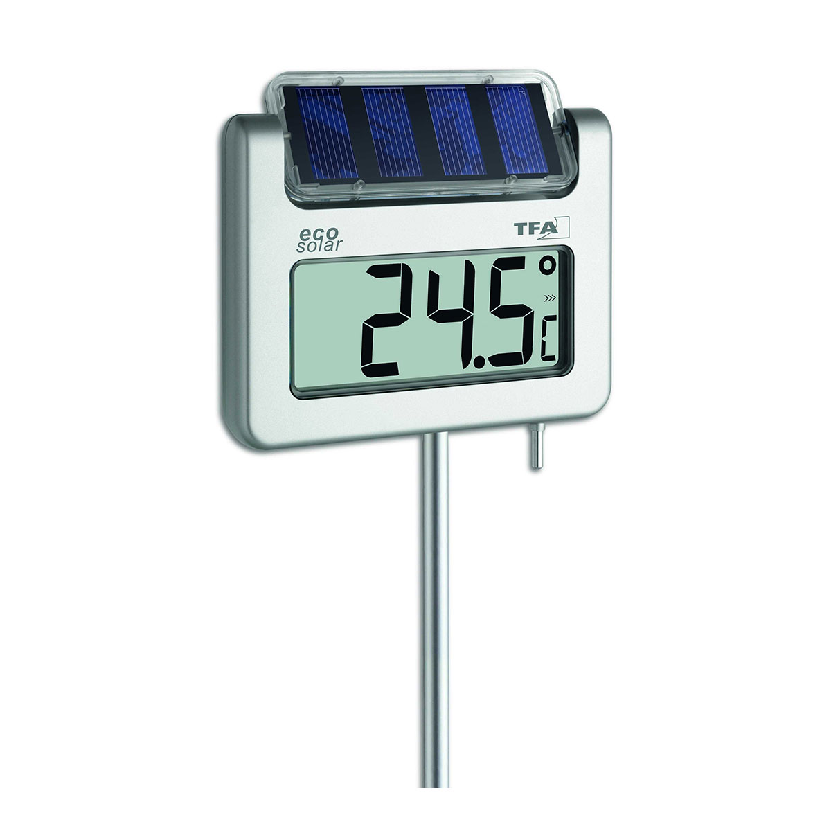 Der teilbare Stab ist aus Aluminium und wird zum Aufstellen einfach in den Boden gesteckt. Die Platzierung des Thermometers mitten im Garten in 1 Meter Höhe hat den Vorteil, dass die Temperaturwerte nicht durch eine Hauswand verfälscht und die tatsächliche Außentemperatur gemessen wird.