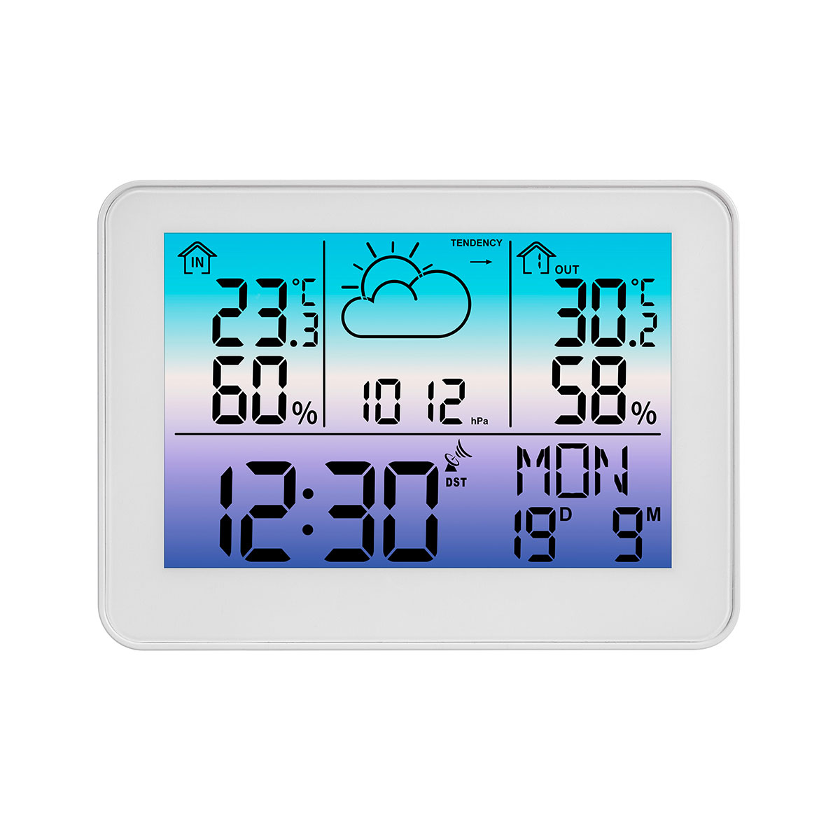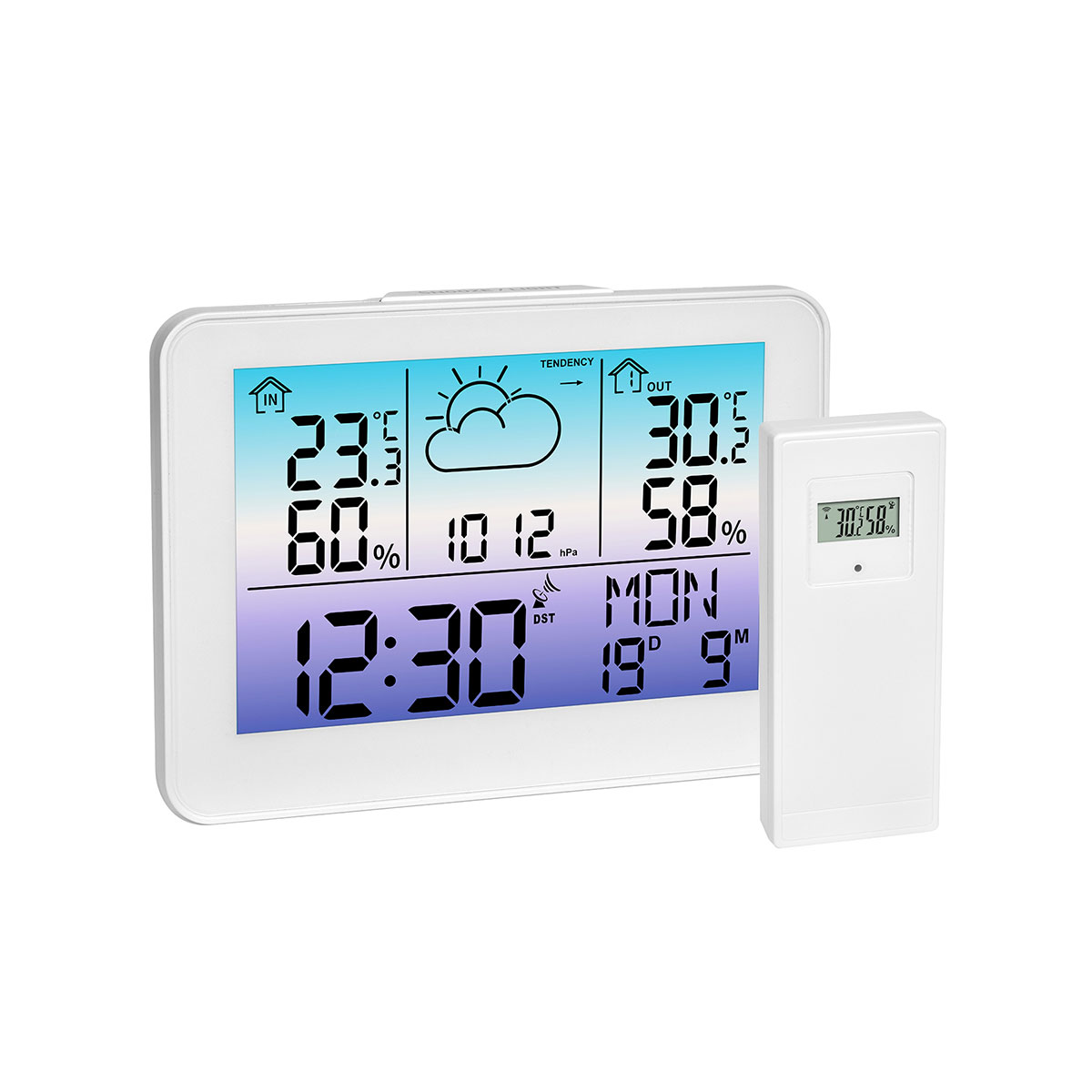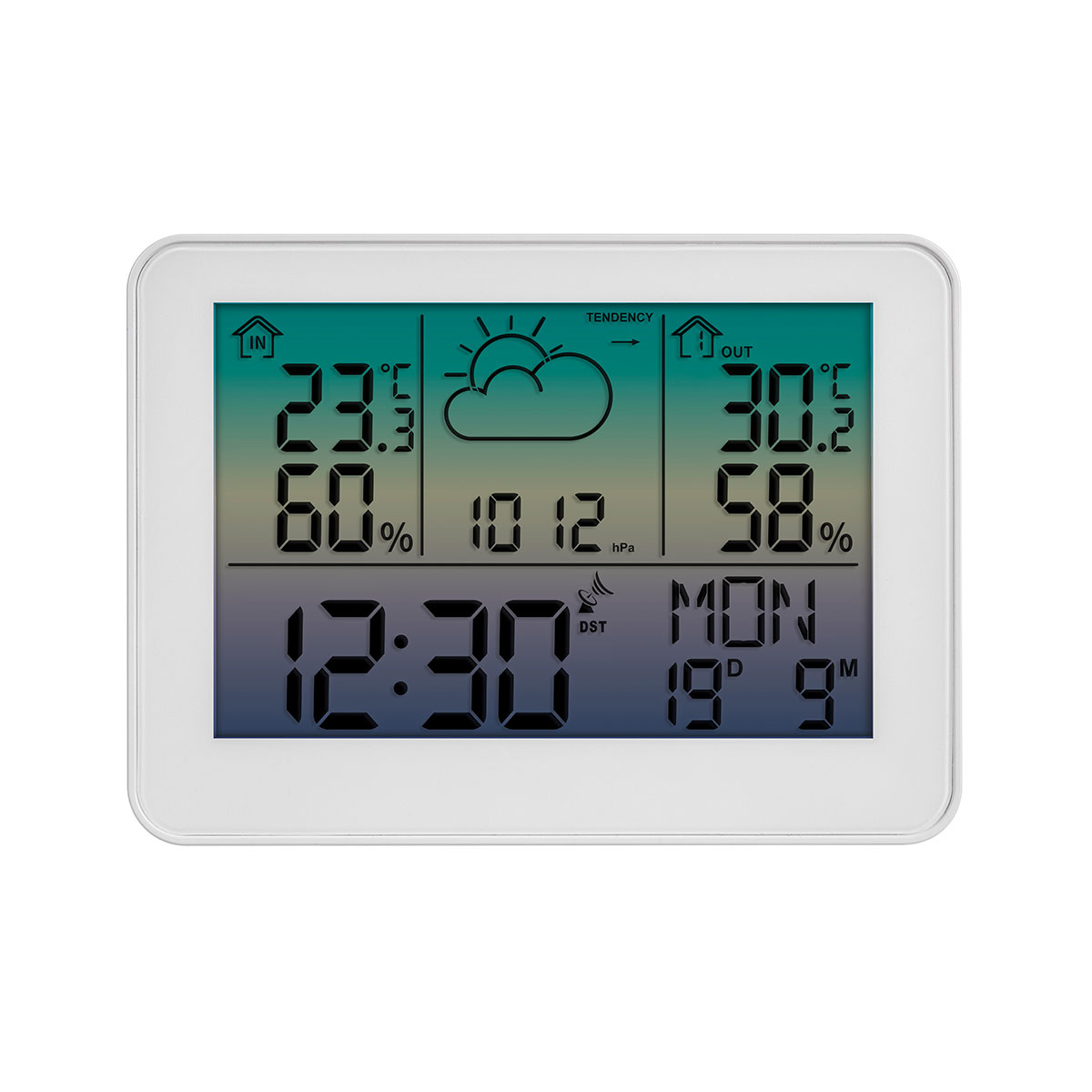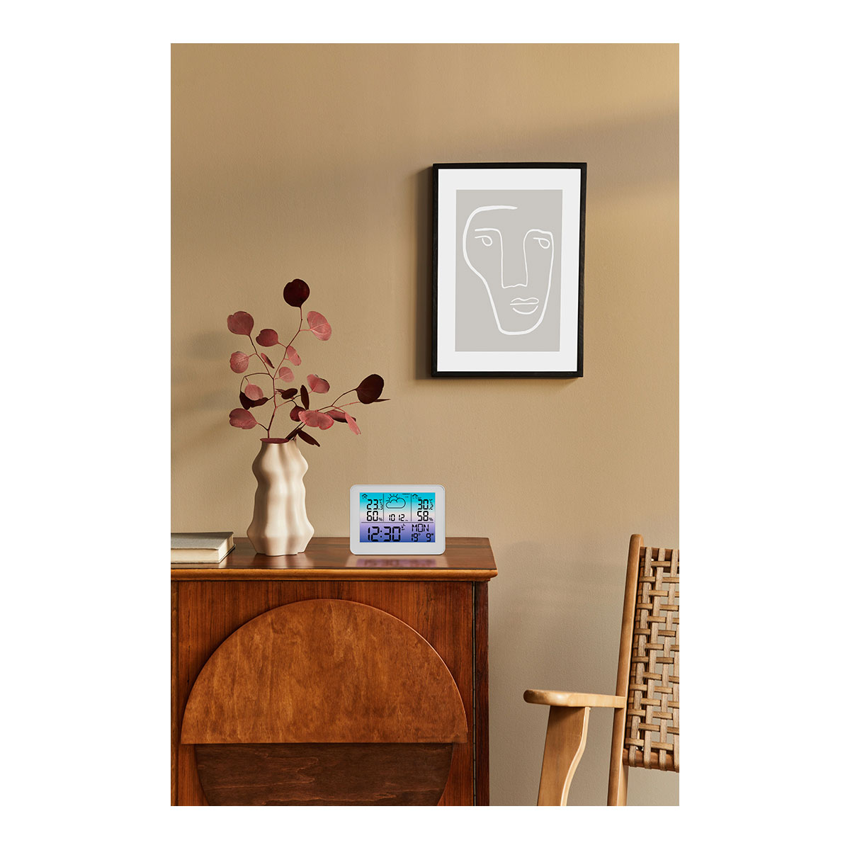 Erleben Sie auf dem Display einen faszinierenden Farbverlauf, der den Himmel in leuchtenden Farben widerspiegelt. Dank ihres eleganten Designs fügt sich die Funk-Wetterstation nahtlos in jede Wohnumgebung ein. Je nach Bedarf kann sie an die Wand gehängt oder aufgestellt werden.