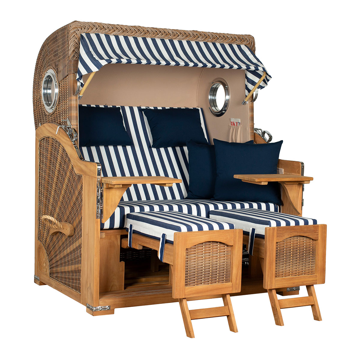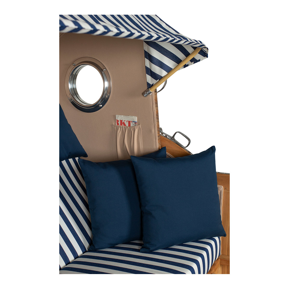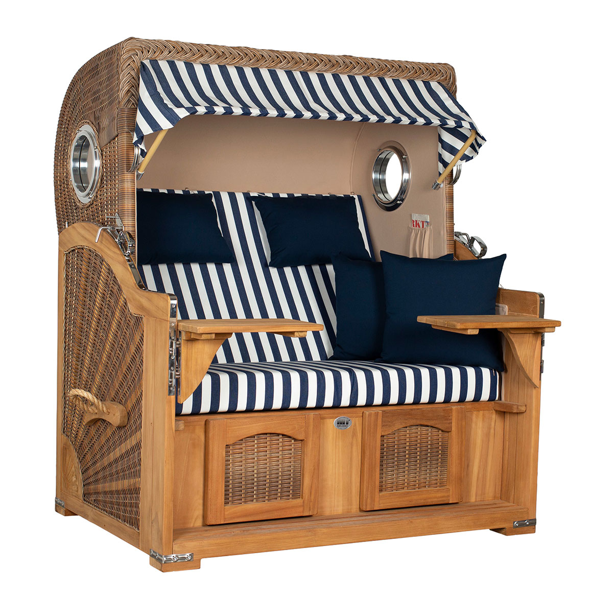 Original Produktbezeichnung: Strandkorb Düne Grande Bullauge Teak PE Banana Dessin 518