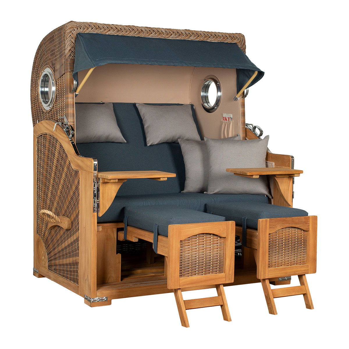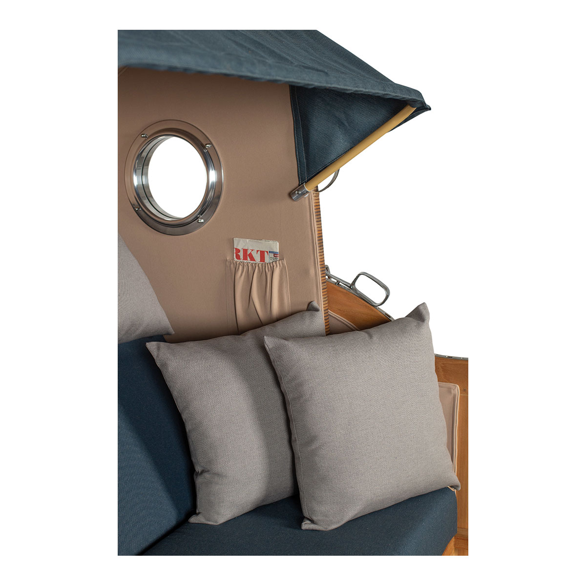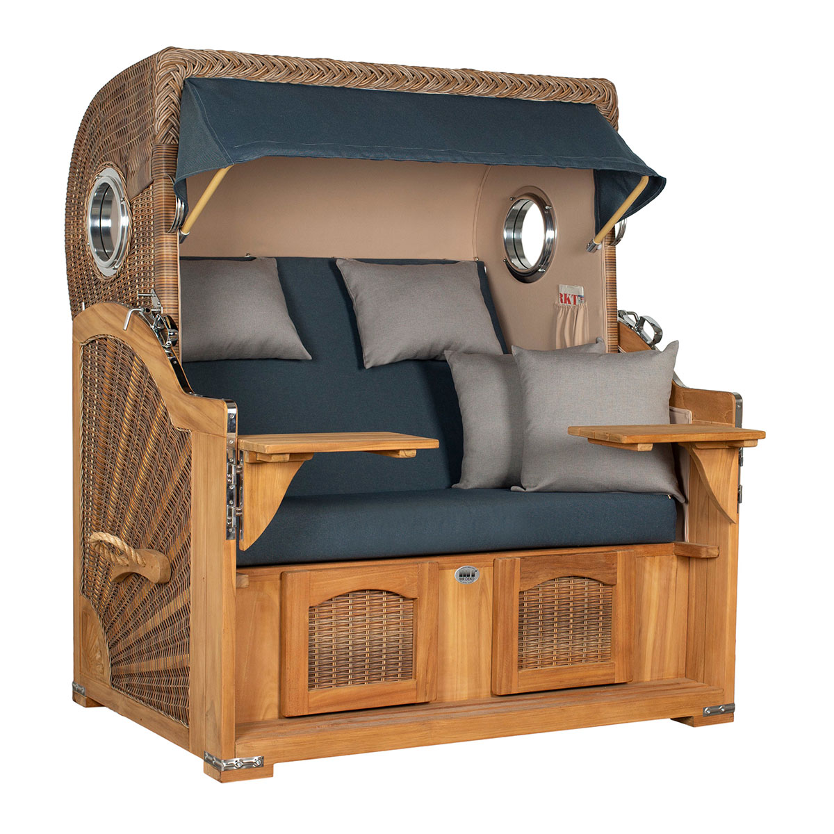 Original Produktbezeichnung: Strandkorb Düne Grande Bullauge Teak PE Banana Dessin 593