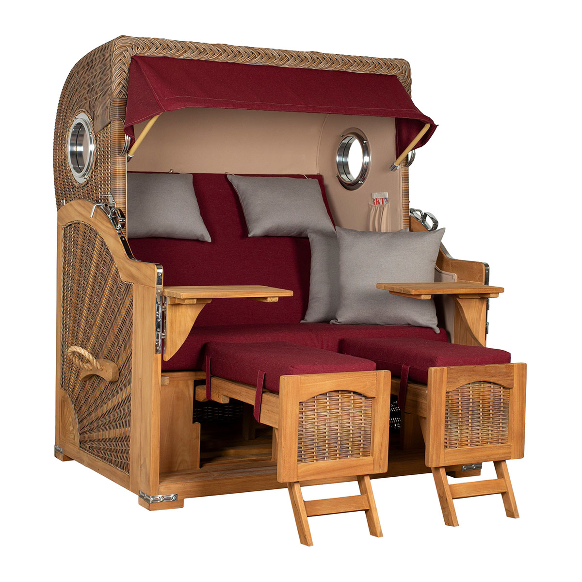 Original Produktbezeichnung: Strandkorb Düne Grande Bullauge Teak PE Banana Dessin 594