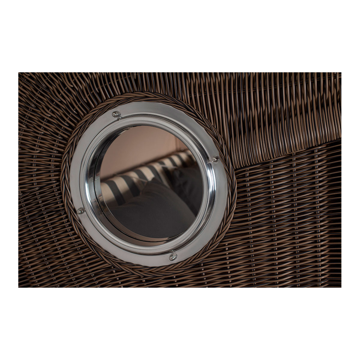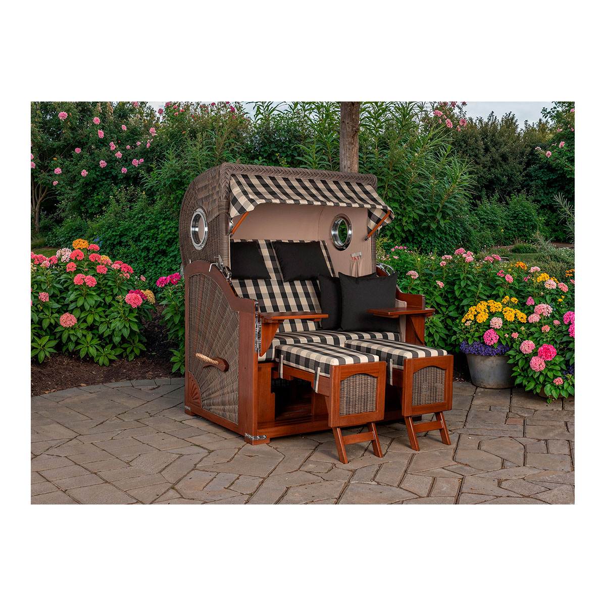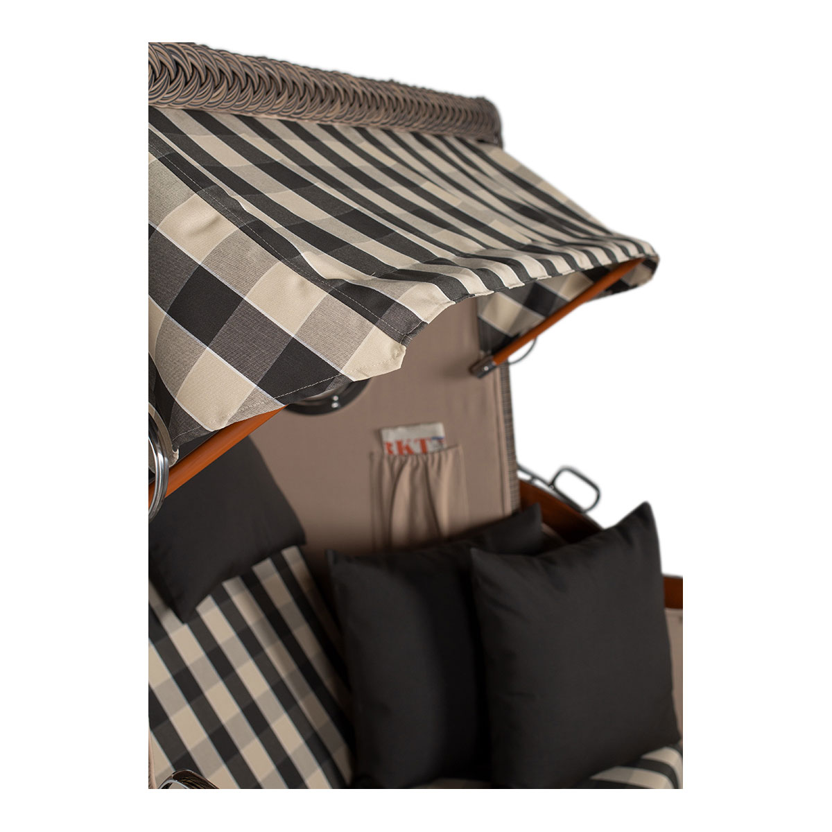 Original Produktbezeichnung: Strandkorb Düne Bullauge Mahagoni PE Grey Dessin 505