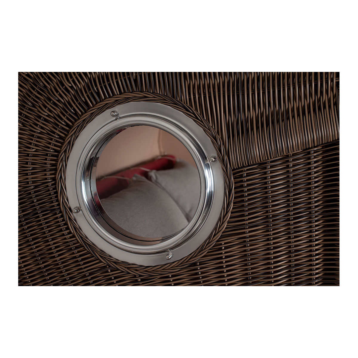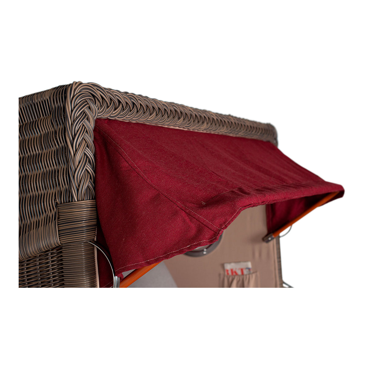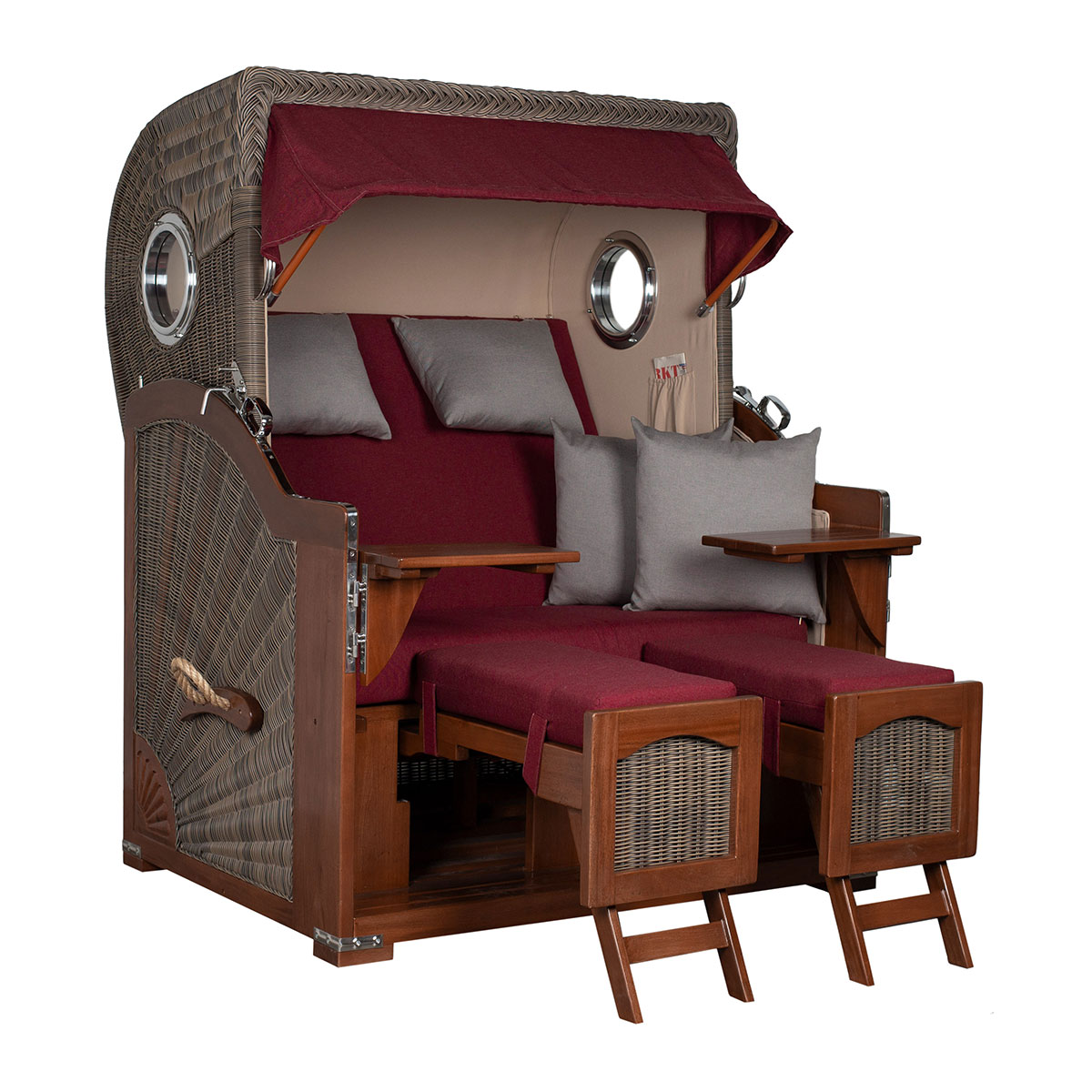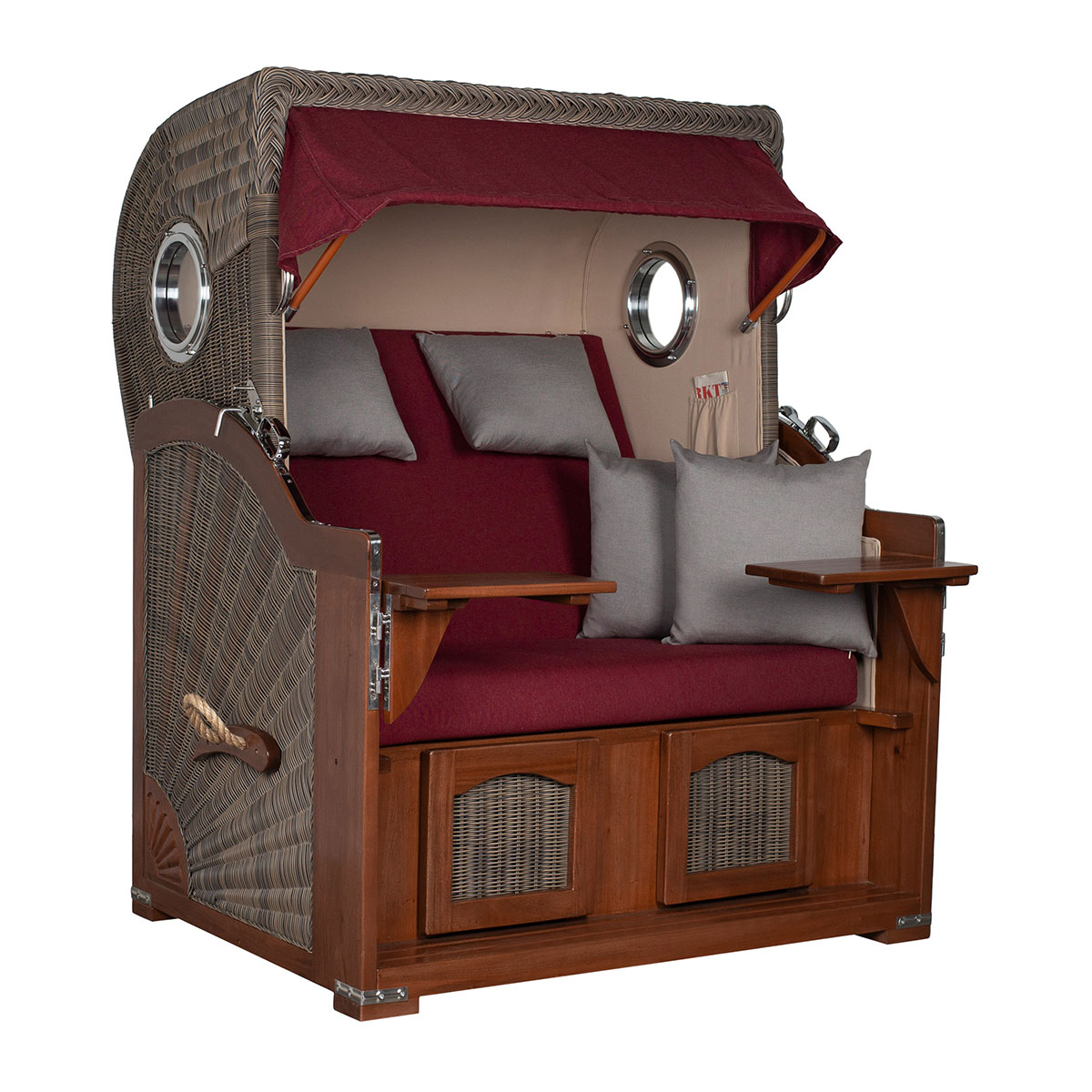 Original Produktbezeichnung: Strandkorb Düne Bullauge Mahagoni PE Grey Dessin 594