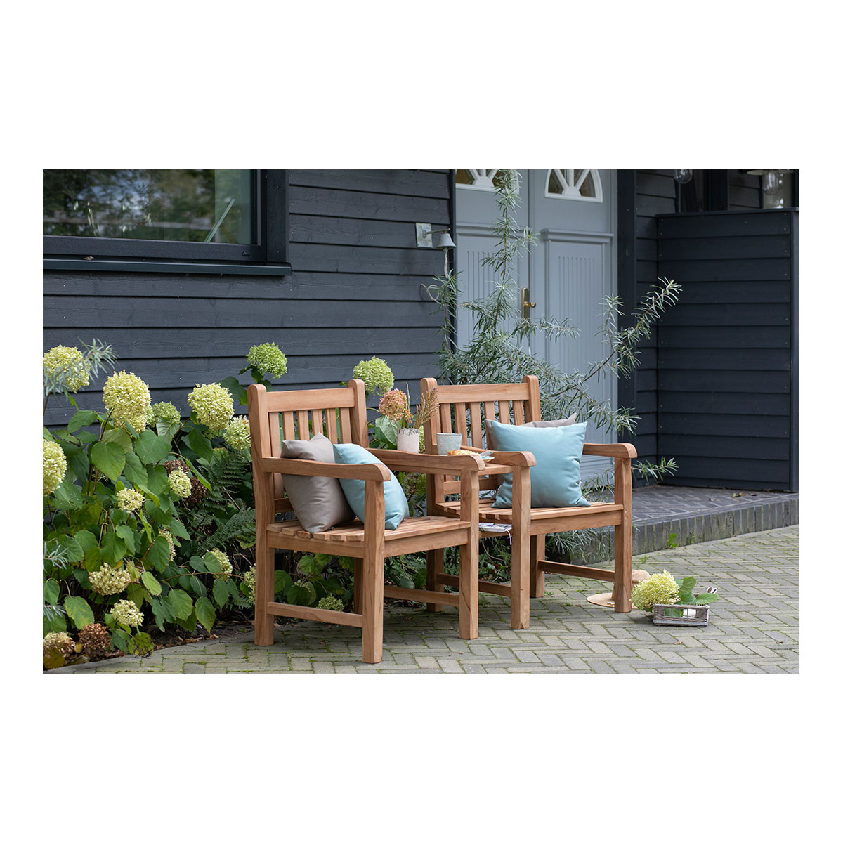 Die Bank besteht aus zwei einzelnen Stühlen, die durch eine praktische Tischplatte miteinander verbunden sind - ideal für Getränke, ein Buch oder eine kleine Pause im Freien. Bei Bedarf lassen sich die Stühle auch ganz einfach trennen, sodass aus einer Bank zwei flexible Einzelsitze werden. Robust, wetterbeständig und zeitlos schön: Diese Gartenbank aus Teak bietet vielseitige Nutzungsmöglichkeiten und schafft einen gemütlichen Ort für entspannte Stunden im Freien.
